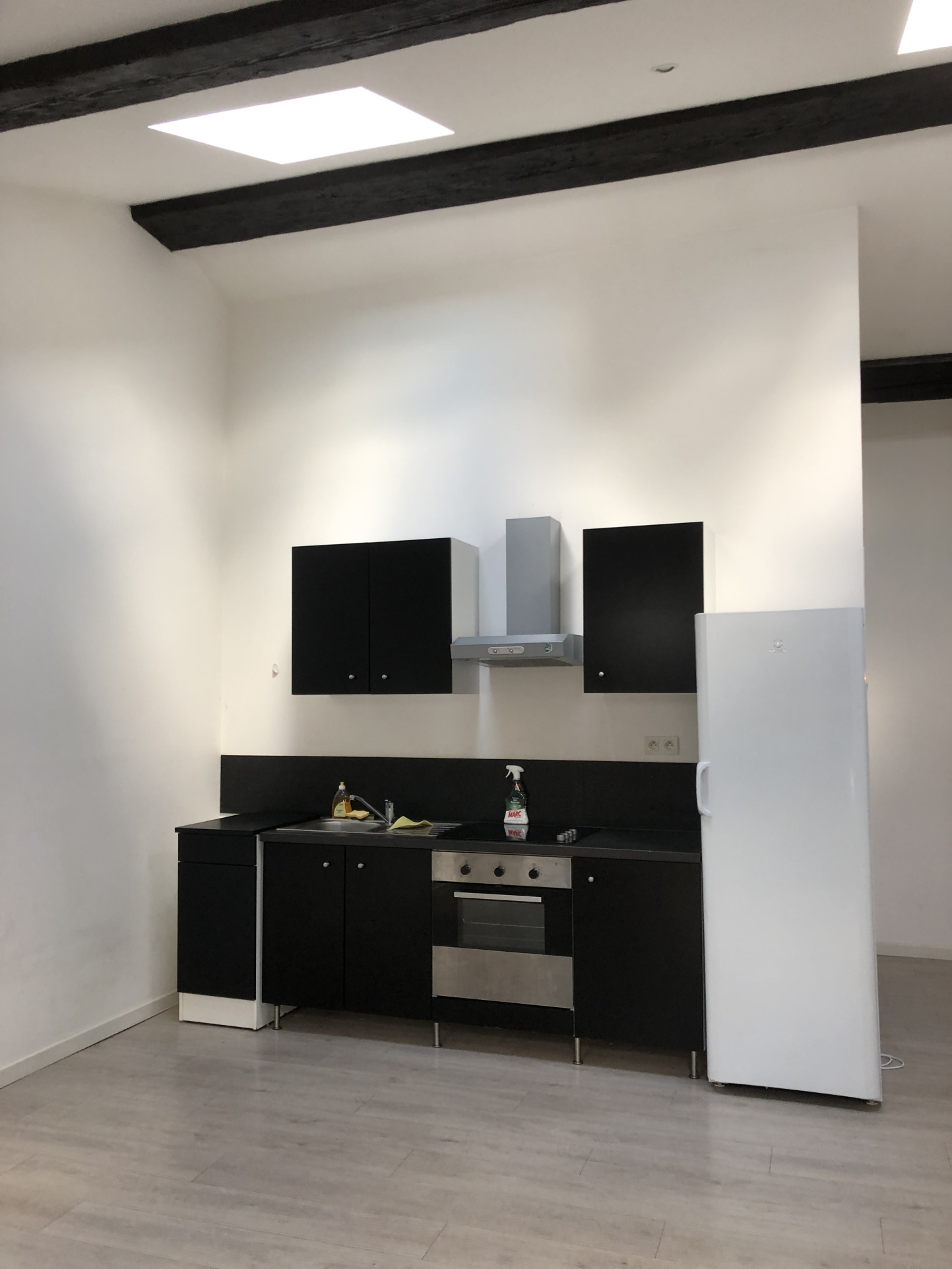 Une cuisine équipée (hotte, plaques de cuisson, four, réfrigérateur)