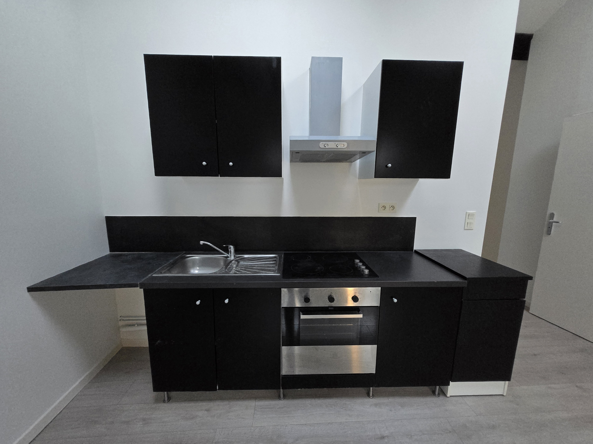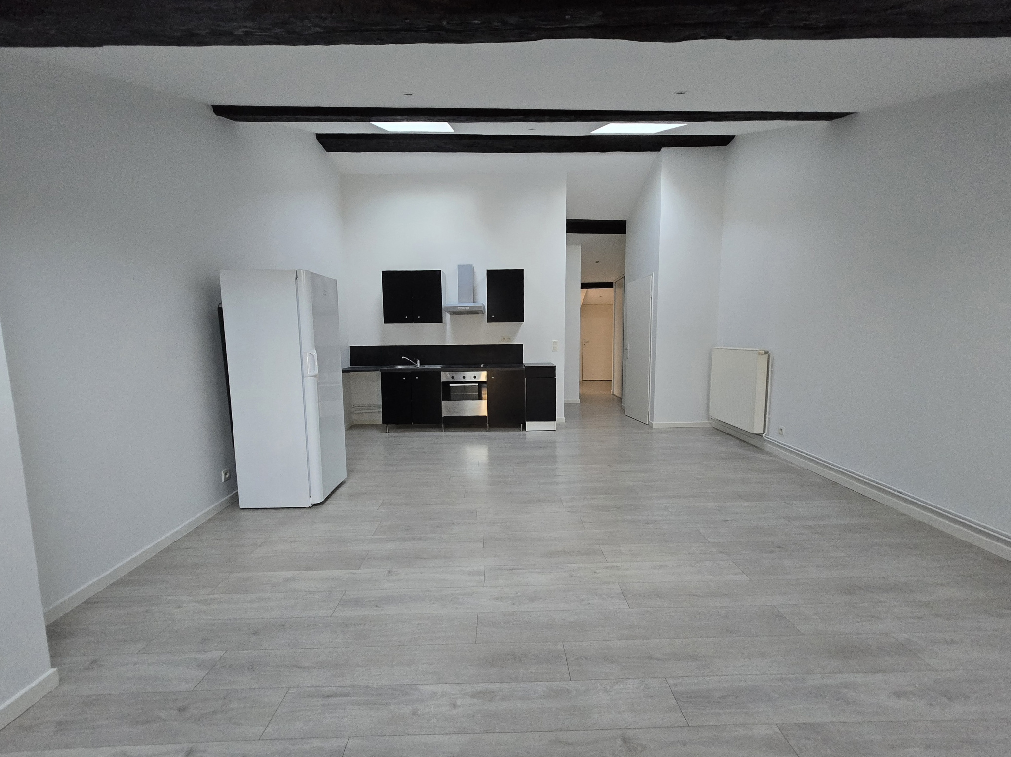 Une cuisine équipée (hotte, plaques de cuisson, four, réfrigérateur) ouverte sur un séjour lumineux