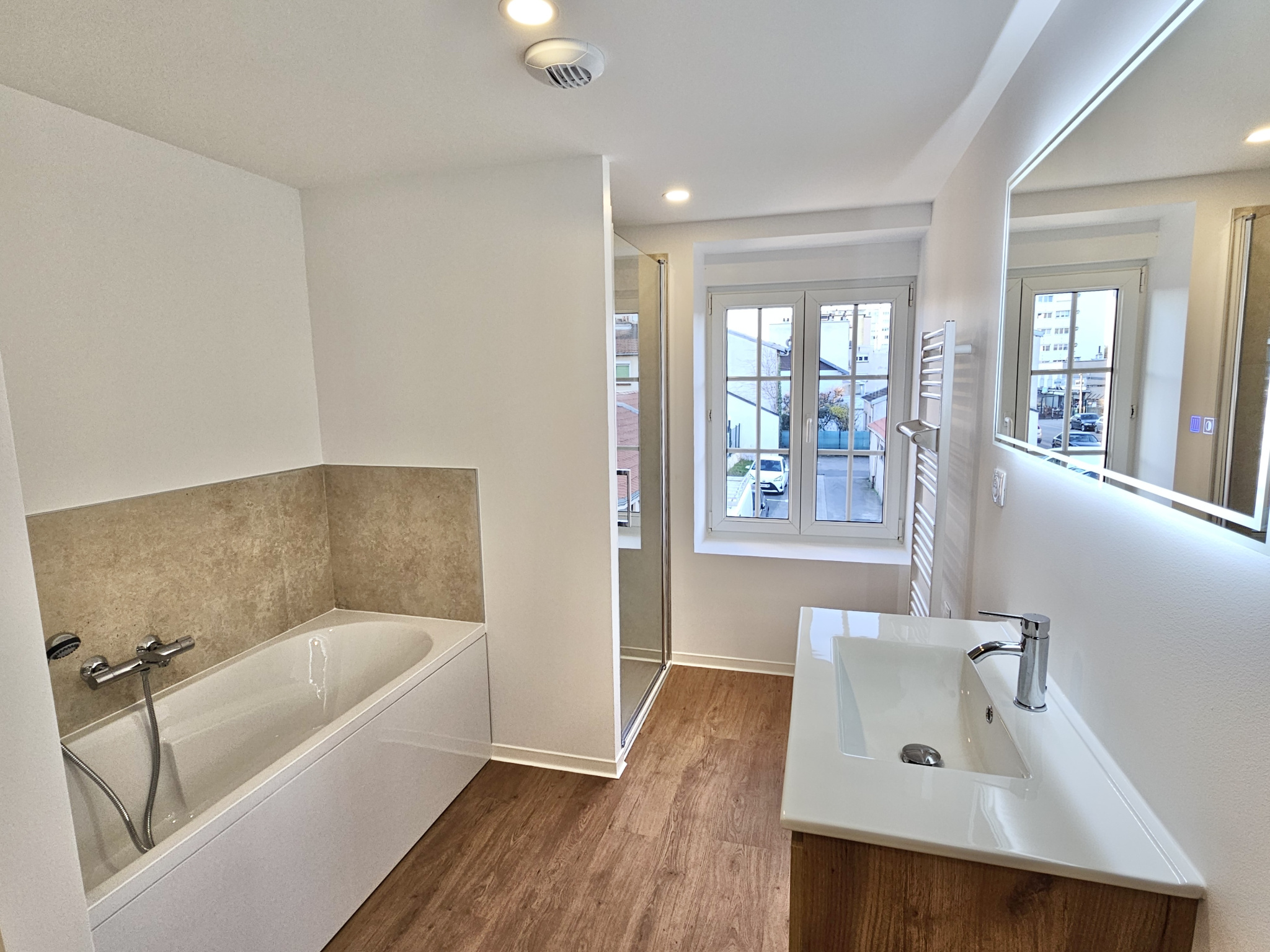 Maison entièrement rénovée de 111 m2 habitables, 3 chambres, garage, terrasse et jardinet, au calme.